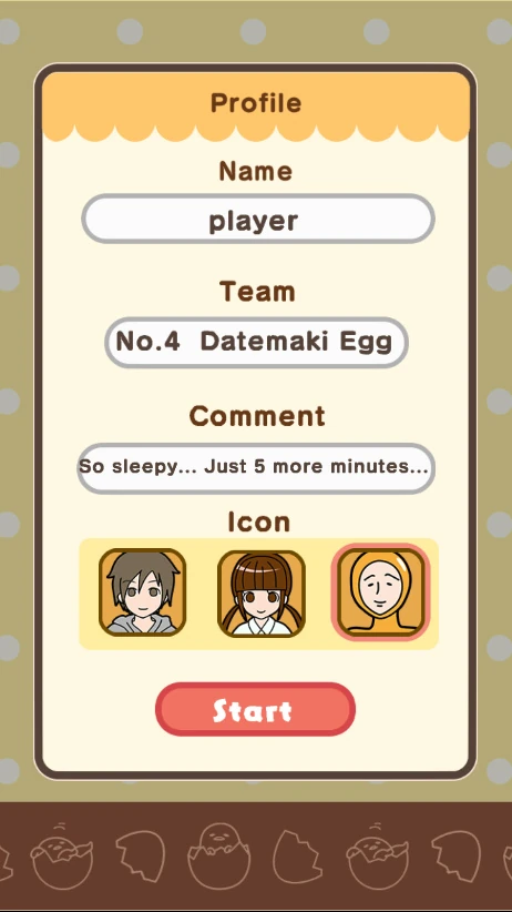 Pick your favorite gudetama. Note: This information is used for events. Once decided, it cannot be changed. In the Japanese version of this game, this corresponds to the prefecture you are from (in Japan).